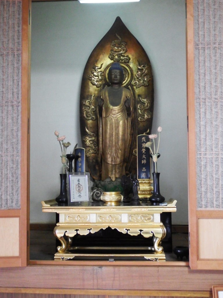 上富田町岩田の三宝寺は(日本の禅宗の1つ)であるが、この寺の一隅に立像の阿弥陀如来がまつられています。